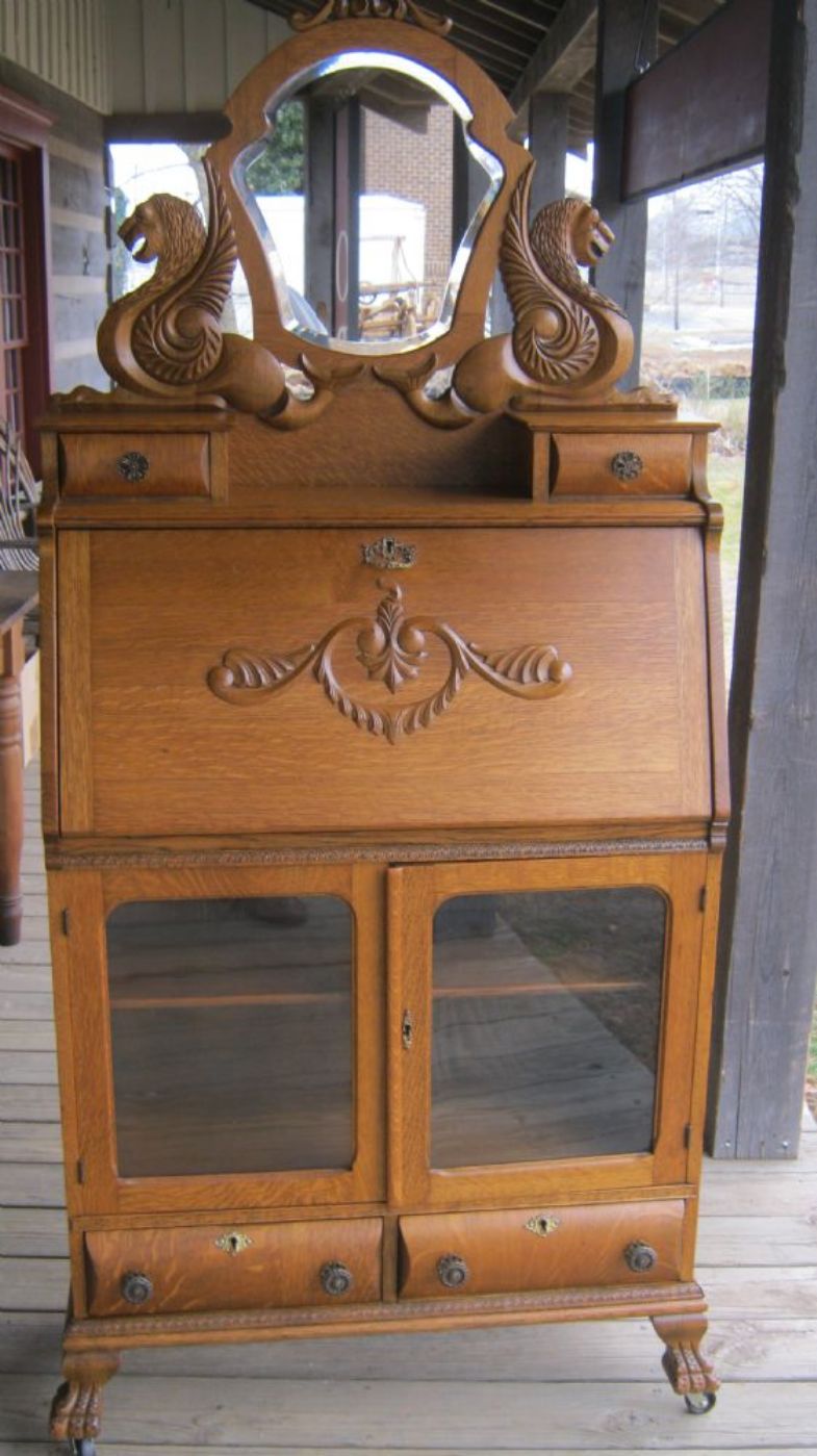 Photo: OAK DROP FRONT DESK. CLAW FEET, BEVELED MIRROR. GARGOYLE FIGURES ON EACH SIDE OF MIRROR, LION'[S HEAD, WINGED BODY WITH FISH TAIL.