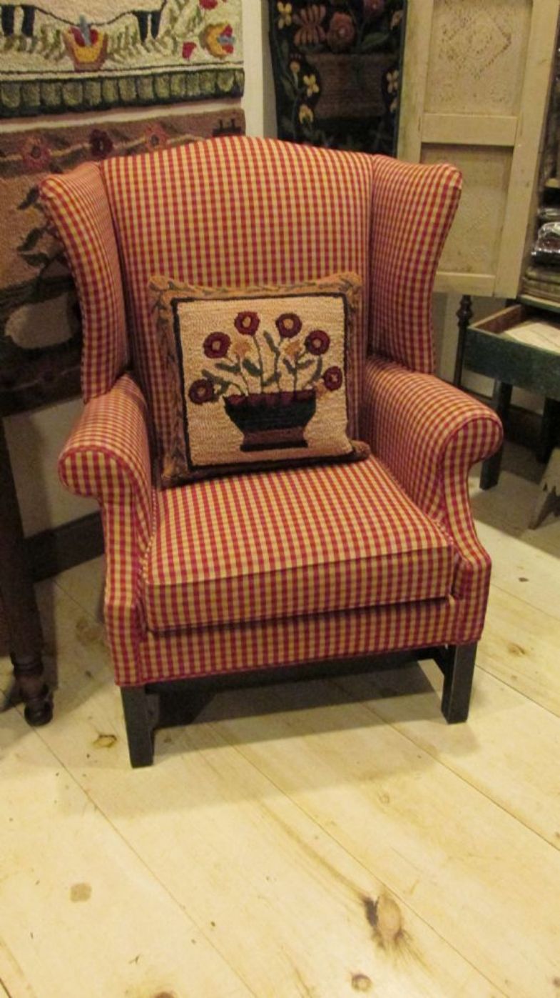 A new winged back chair in a small red and cream check which just arrived this week. One of many new hooked pillows also shown which we carry. - By: Lakes Online Member