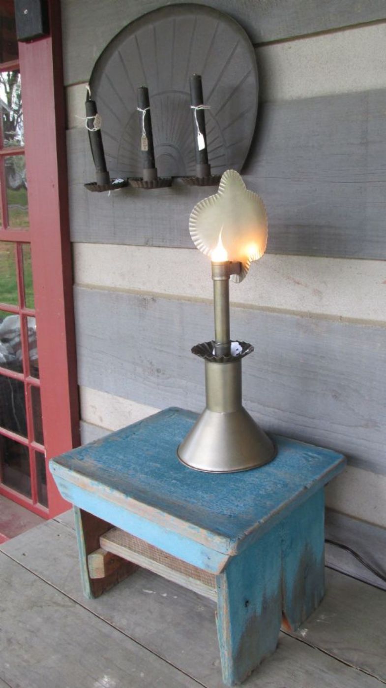 New 3-candle wall sconce. A new electric country light sitting a on neat blue stool (circa 1940's-1950's). - By: Lakes Online Member